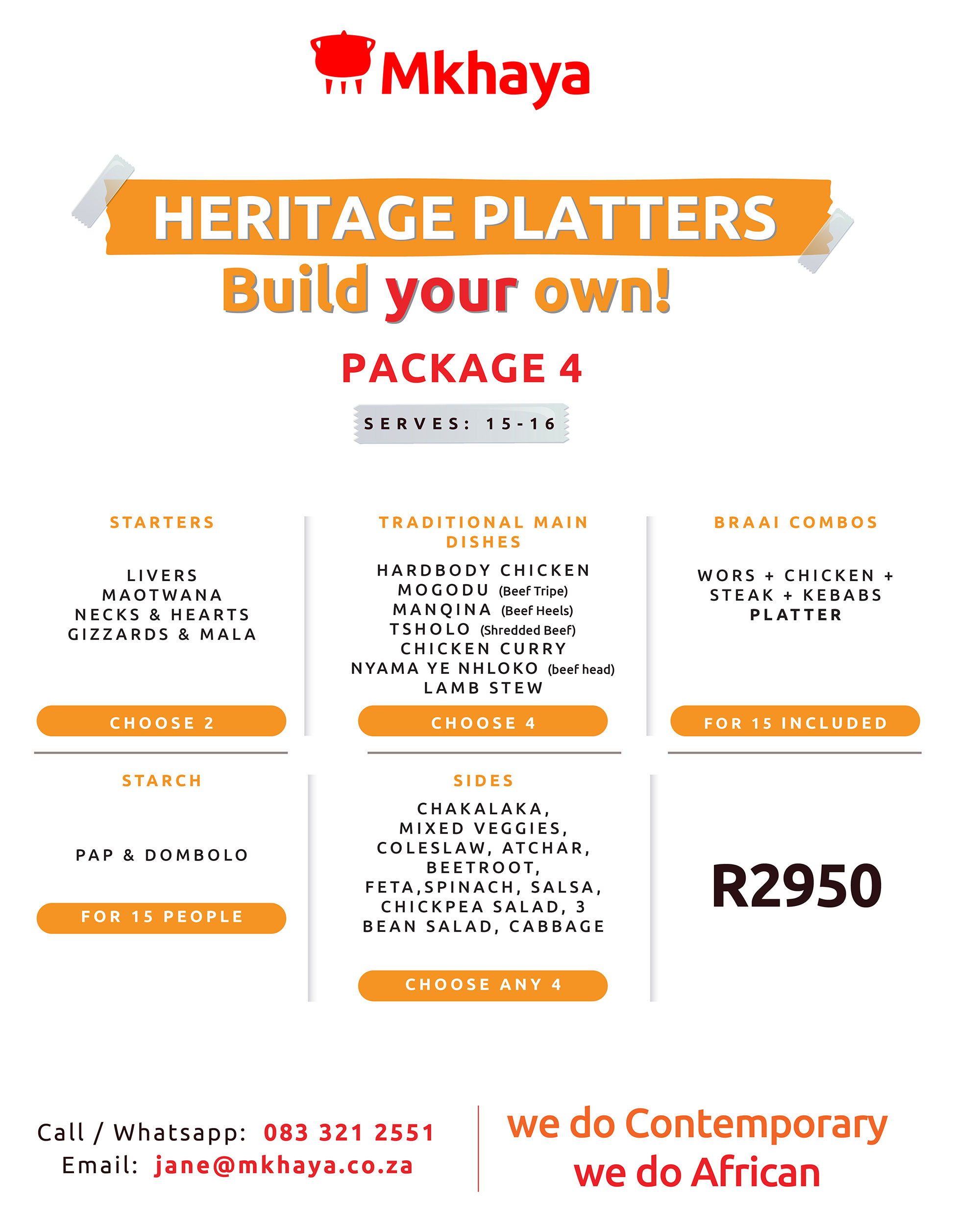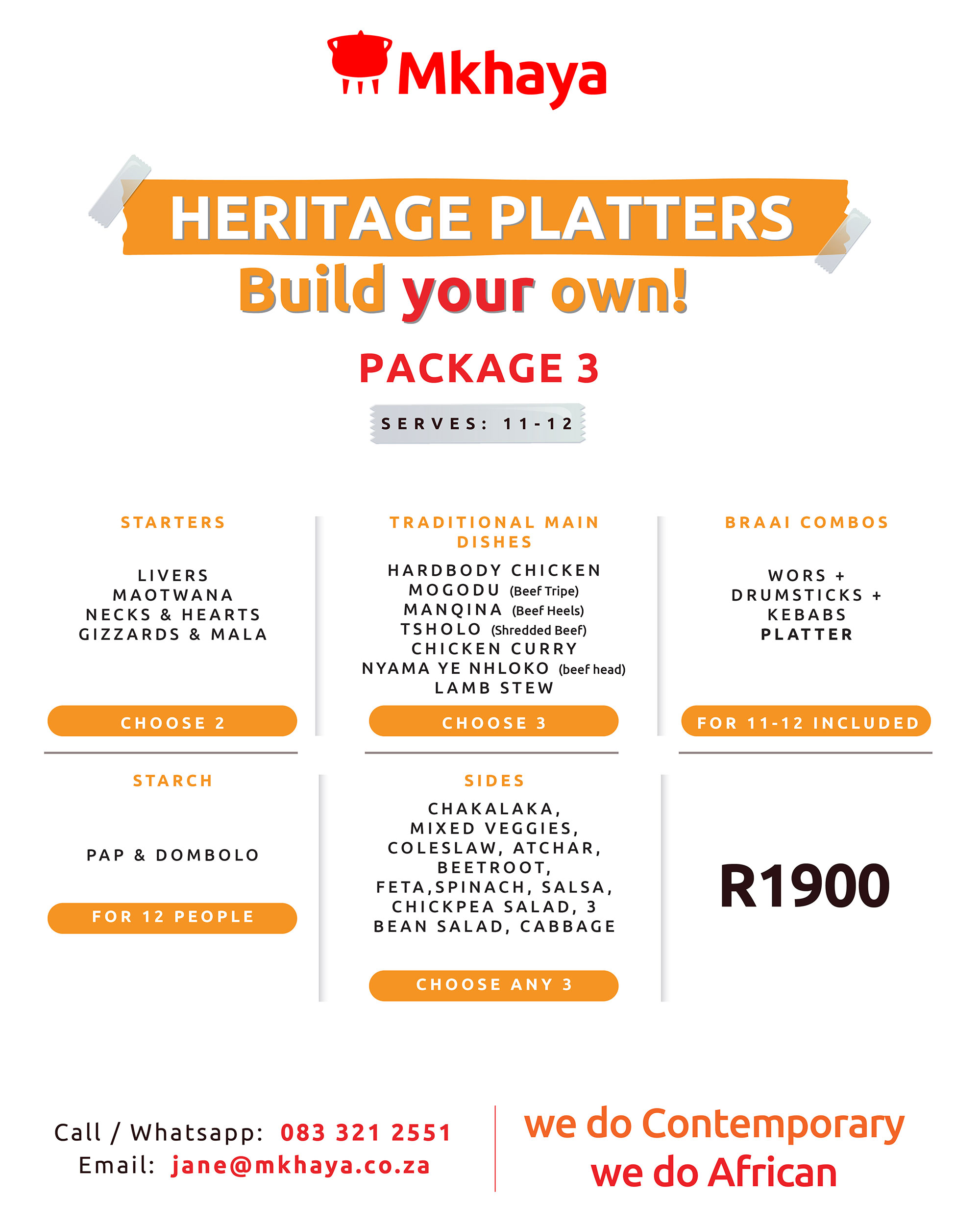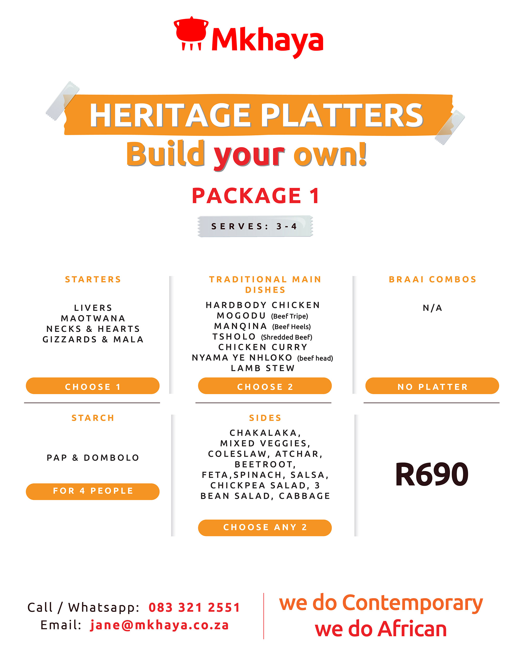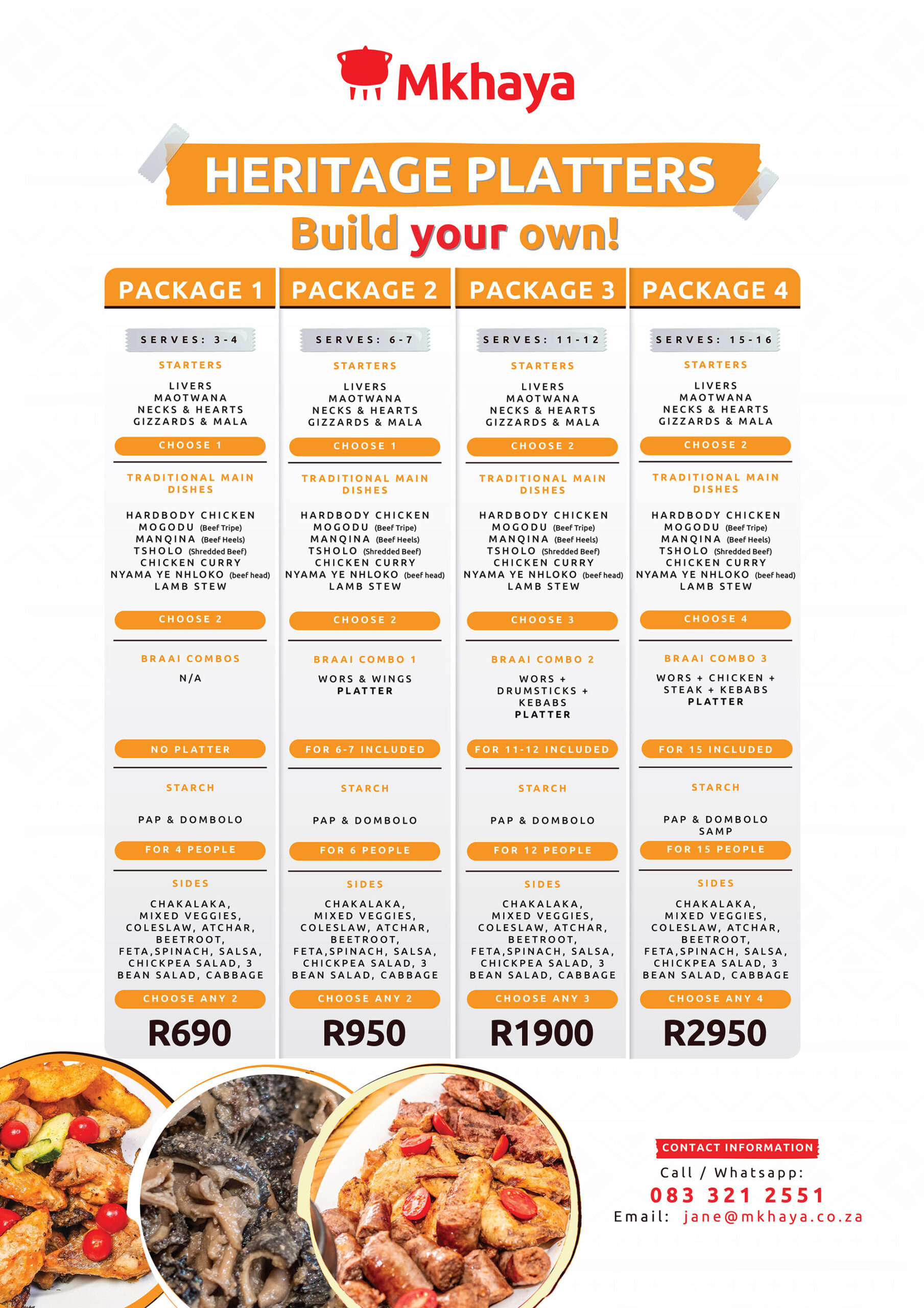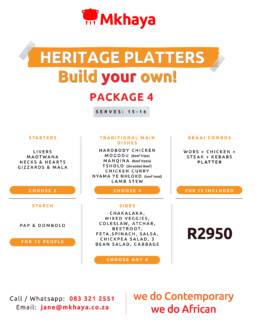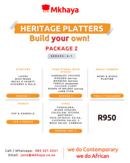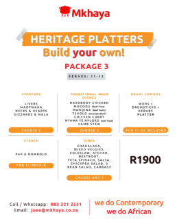 Sizzling September Specials!View All Heritage Platters Heritage Month is here! Celebrate the rich spirit of Africa the best way we know how. * Valid only for the Month of September 2025and for a minimum of 30 people.For any other customized catering enquiries, please fill out our online catering form or call083 321 2551View our catering options